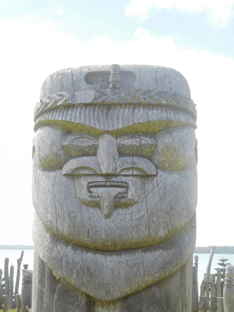 Les totems sont présents un peu partout sur le Caillou, il s’agit de sculptures ayant une symbolique forte souvent liée aux ancêtres et aux esprits protecteurs. On en trouve sur les flèches faîtières des « grandes cases », sur les chambranles et aussi à l’entrée des villages ou des maisons ou sites coutumiers importants.