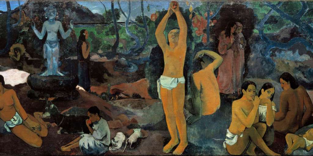 Trois filles avec un enfant nous racontent le début de la vie avec une mère allongée qui accouche; le groupe intermédiaire nous parle de l’existence quotidienne de la maturité avec l’éclat sexuel de la beauté; le dernier groupe, ou plutôt la vieille femme, se rapproche de la mort, à première vue car, à ses pieds, un oiseau blanc est représenté, qui peut-être se prépare à l’emmener ailleurs… L’idole bleue représentée dans la vue arrière raconte probablement l’histoire de l’autre monde. En ce qui concerne ce tableau, GAUGUIN déclara ce qui suit: « J’ai la conviction que cette toile a une supériorité non seulement sur toutes mes précédentes, mais aussi que je ne pourrai jamais créer une œuvre meilleure ou similaire »