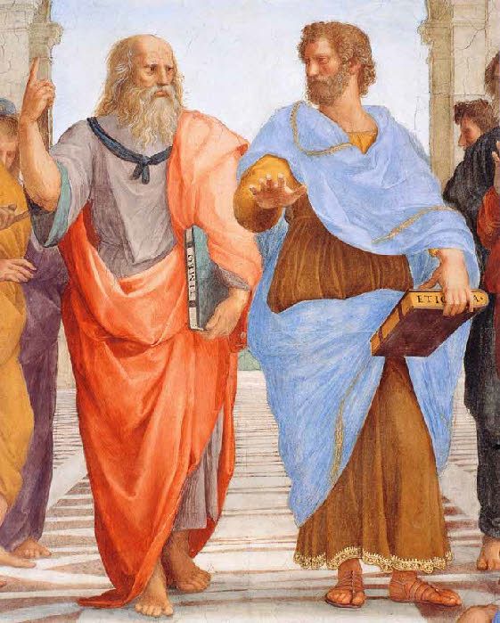 Platon tient dans sa main l’un de ses dialogues, Le Timée tandis qu’Aristote a son Éthique à la main.