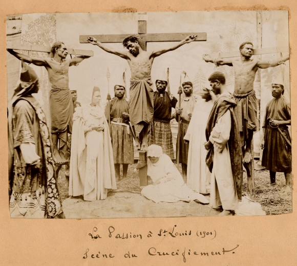 Photo – La Passion à Saint Louis (1901). Scène du crucifiement, église de la Commune du Mont-Dore :
