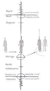 L’esprit s’incarne dans l’être à la naissance puis il se détachera de l’homme à la mort pour rejoindre à nouveau le monde invisible des ancêtres d’où il pourra renaître à nouveau (métempsychose ou réincarnation) et ce, dans un cycle perpétuel.