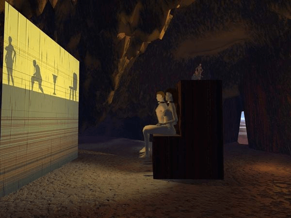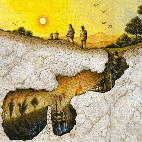 « – Figure-toi des hommes dans une demeure souterraine en forme de caverne, dont l’entrée, ouverte à la lumière, s’étend sur toute la longueur de la façade ; ils sont là depuis leur enfance, les jambes et le cou pris dans des chaînes, en sorte qu’ils ne peuvent bouger de place, ni voir ailleurs que devant eux; car les liens les empêchent de tourner la tête; la lumière d’un feu, allumé au loin sur une hauteur brille derrière eux: entre le feu et les prisonniers il y a une route élevée; le long de cette route figure-toi un petit mur, pareil aux cloisons que les montreurs de marionnettes dressent entre eux et le public et au-dessus desquelles ils font voir leurs prestiges.