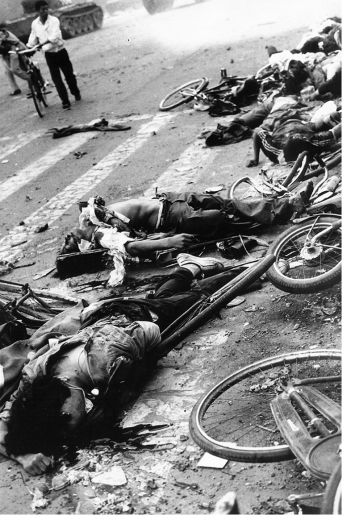 En 1989, place Tienanmen en Chine, des étudiants sont morts écrasés sous les chars. Ils quittaient la place quand trois chars ont surgi au milieu des nuages de fumée et foncé vers eux. Tout ceux qui n’ont pas eu le temps ou la force de sauter les barrières métalliques bordant la chaussée ont été écrasés sous les chenilles. Puis les chars ont continué leur route, laissant au bord du trottoir une scène d’apocalypse.