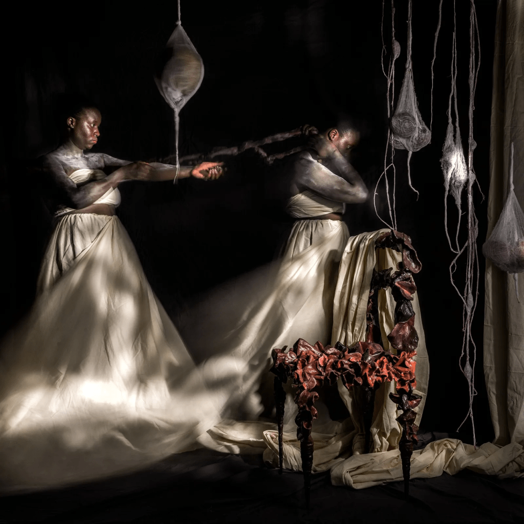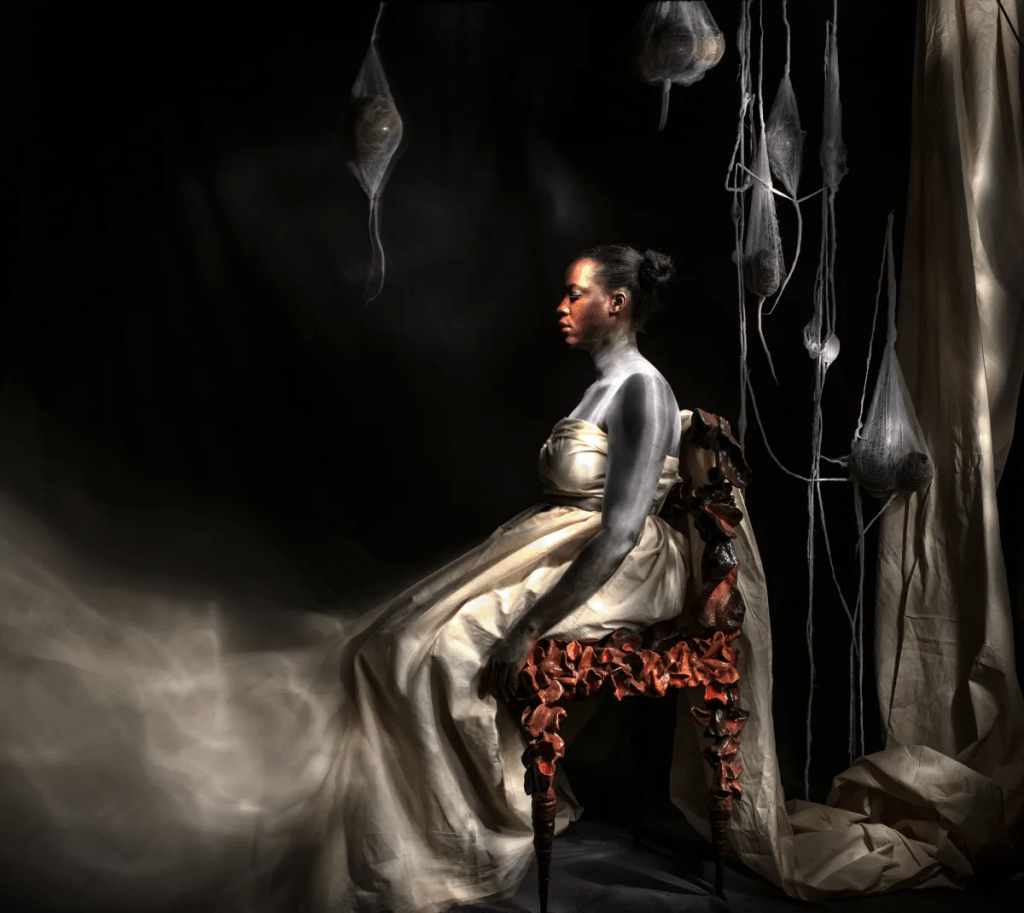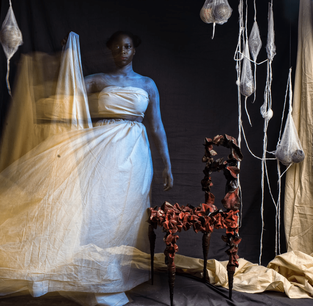 La série photographique Seat of Honor (Le siège d’honneur) de l’artiste ougandaise Stacey Gillian Abe représente une mariée fantomatique qui surgit d’un fond noir. Quels sont les symboles présents dans cette œuvre ? Et quel est le message de l’artiste ? Pour le savoir, observons ces photos d’un peu plus près :