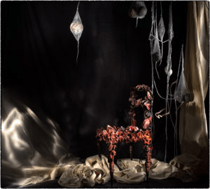 Stacy Gillian Abe est née en Ouganda. La cause des femmes est au cœur de son œuvre. Pour elle, les femmes sont encore soumises à deux injonctions : le mariage, qu’elle voit ici comme un enchaînement, et la reproduction, symbolisée par ces mystérieuses formes suspendues, évoquant des chrysalides ou des gamètes.