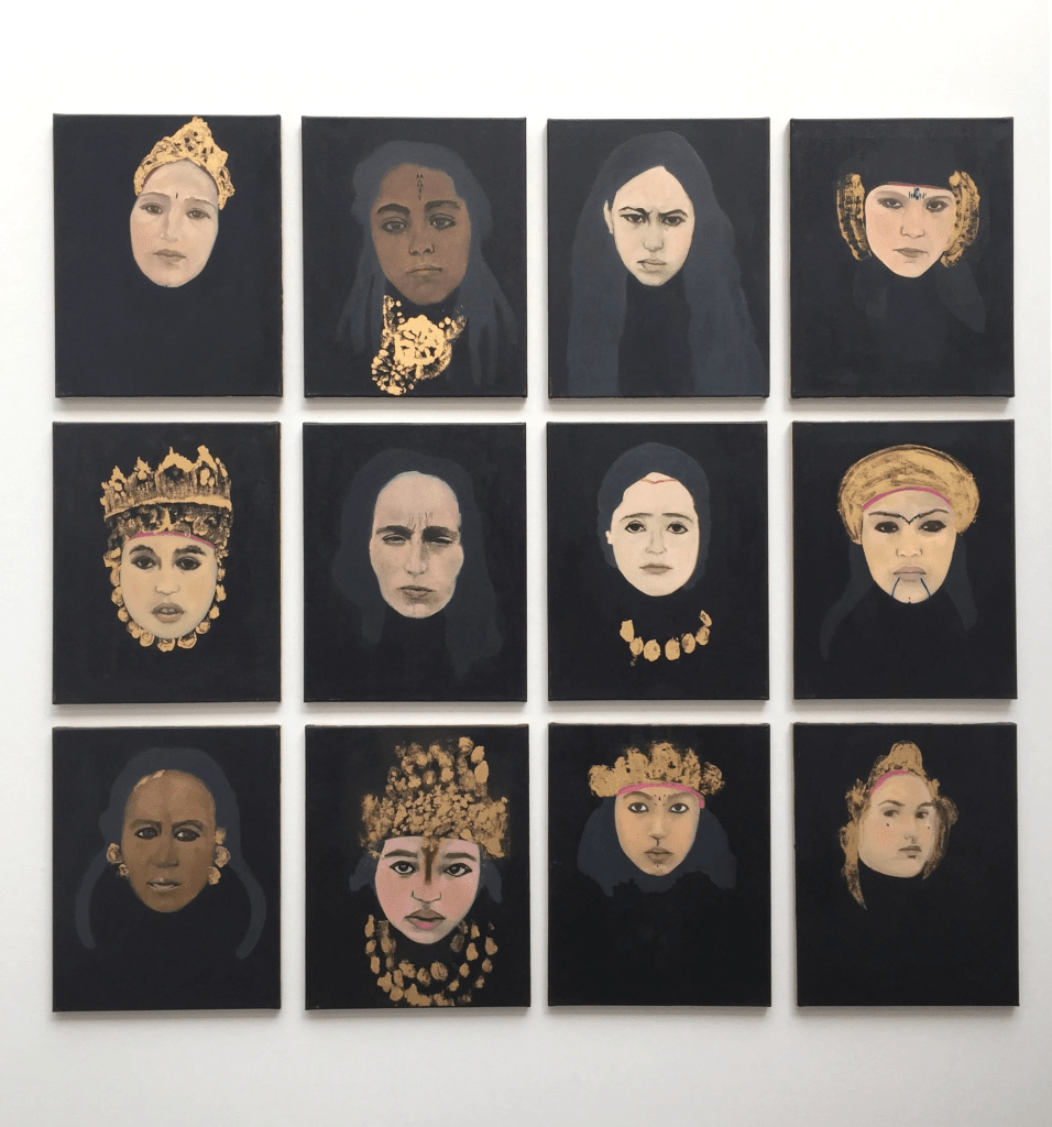 Dans son tableau Princesses, douze visages de femmes se détachent d’un fond noir. C’est un clair-obscur à la Velasquez. L’artiste s’est inspirée des portraits de femmes immortalisés par le photographe et cinéaste Marc Garanger (1935-2020) lors de la guerre d’Algérie.