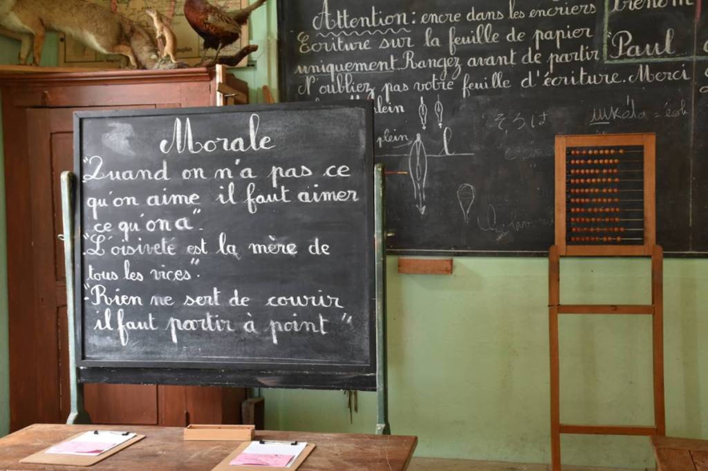 Si sa mission principale est d’enseigner l’écriture, le calcul, la géographie, l’histoire de France, les sciences naturelles et la gymnastique, le « maître » (comme la « maîtresse ») est aussi professeur de morale. Chaque matin, il écrit une maxime au tableau et la commente pour ses élèves comme le montre ces quelques photographies :