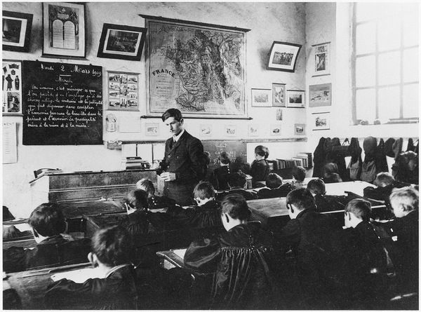 On a vanté l’école française de Jules Ferry mais il importe de souligner ici que le progrès de la scolarisation fut une tendance générale de Europe de l’Ouest au XIXe siècle et que l’école publique, gratuite et obligatoire telle que définie par la loi Ferry du 28 mars 1882, constituait en réalité par rapport à nos voisins européens un phénomène assez tardif en France où elle revêt une importance particulière, pour deux raisons. D’une part, l’École, qui est aussi laïque, lutte contre l’influence très présente de l’Eglise catholique. D’autre part, au nom de l’idée courante à l’époque que c’est le maître d’école prussien qui a vaincu à Sedan, (en Allemagne tous allaient à l’école depuis longtemps) elle doit préparer les futurs citoyen et tout autant les futurs soldats qui devront reconquérir l’Alsace et la Lorraine perdues.