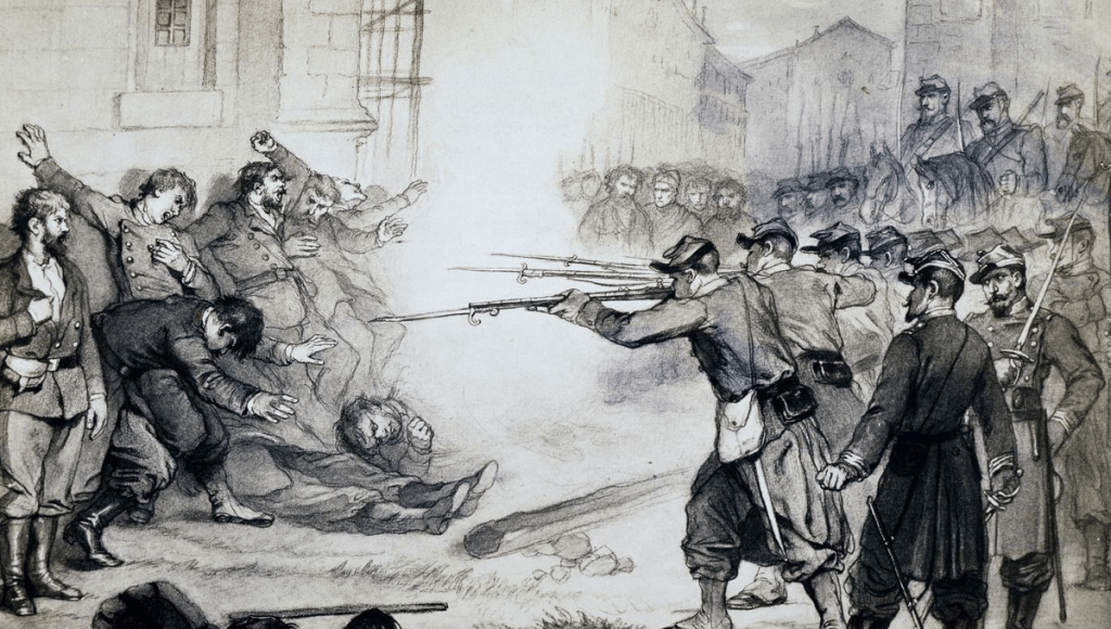 La Troisième République est proclamée par la foule parisienne le 4 septembre 1870 à la suite du désastre de Sedan qui scella la défaite de la France dans la guerre contre la Prusse. Cette véritable déroute entraîne immédiatement la déchéance de Napoléon III, la proclamation de la République et le soulèvement populaire de la Commune de Paris (18 mars 1871 – 28 mai 1871) réprimé dans le sang :