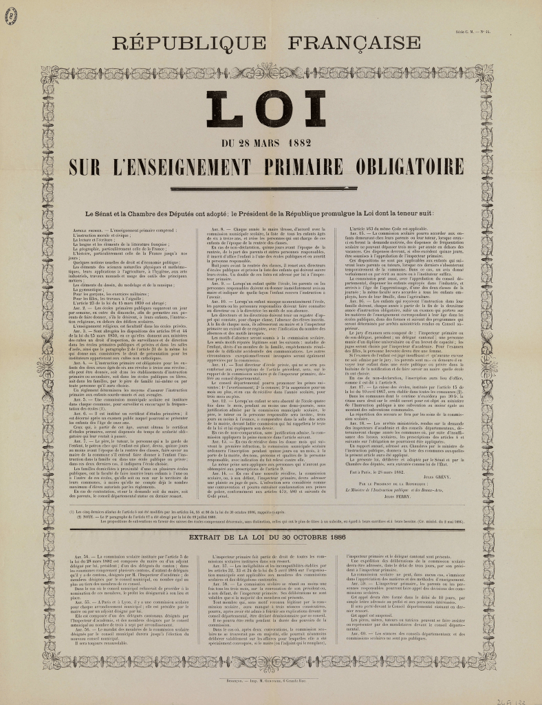 Complétant la loi du 16 juin 1881 qui fixe la gratuité de l’école primaire, ce document présente les principaux articles de la loi du 28 mars 1882 précisant la nature des disciplines enseignées (article 1), la durée de la scolarité qui devient obligatoire (article 4), et impose un jour de la semaine vaqué et destiné à l’instruction religieuse hors de l’école (article 2). La neutralité religieuse de l’école est donc explicitement institutionnalisée. Claude Lelièvre, dans son Histoire des institutions scolaires, 1789-1889 souligne que l’on aurait tort de l’interpréter comme un combat anticlérical : il s’agit surtout de s’appuyer sur l’école pour affermir la République et imposer les valeurs républicaines.