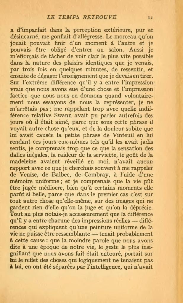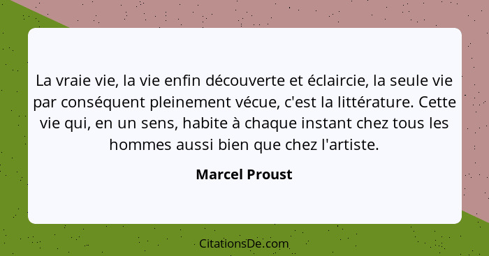 « La vraie vie, la vie enfin découverte et éclaircie, la seule vie par conséquent pleinement vécue, c’est la littérature. Cette vie qui, en un sens, habite à chaque instant chez tous les hommes aussi bien que chez l’artiste. Mais ils ne la voient pas, parce qu’ils ne cherchent pas à l’éclaircir. Et ainsi leur passé est encombré d‘innombrables clichés qui restent inutiles parce que l’intelligence ne les a pas « développés ». // Notre vie ; et aussi la vie des autres ; car le style pour l’écrivain aussi bien que la couleur pour le peintre est une question non de technique mais de vision. Il est la révélation, qui serait impossible par des moyens directs et conscients, de la différence qualitative qu’il y a dans la façon dont nous apparaît le monde, différence qui, s’il n’y avait pas l’art, resterait le secret éternel de chacun. Par l’art seulement nous pouvons sortir de nous, savoir ce que voit un autre de cet univers qui n’est pas le même que le nôtre et dont les paysages nous seraient restés aussi inconnus que ceux qu’il peut y avoir dans la lune. (…) //