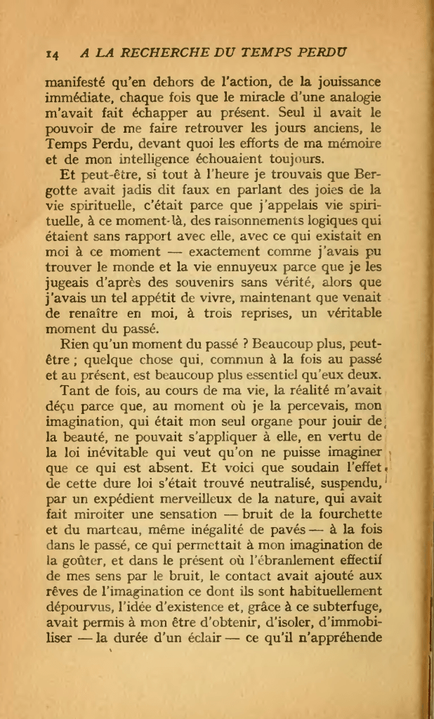 « Il y avait déjà bien des années que, de Combray, tout ce qui n’était pas le théâtre et le drame de mon coucher, n’existait plus pour moi, quand un jour d’hiver, comme je rentrais à la maison, ma mère, voyant que j’avais froid, me proposa de me faire prendre, contre mon habitude, un peu de thé. Je refusai d’abord et, je ne sais pourquoi, me ravisai. Elle envoya chercher un de ces gâteaux courts et dodus appelés Petites Madeleines qui semblent avoir été moulés dans la valve rainurée d’une coquille de Saint- Jacques. Et bientôt, machinalement, accablé par la morne journée et la perspective d’un triste lendemain, je portai à mes lèvres une cuillerée du thé où j’avais laissé s’amollir un morceau de madeleine.