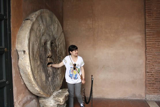 Vacances romaines (Roman Holiday) est un film réalisé en 1953 par William Wyler avec Audrey Hepburn, Gregory Peck. Comédie romantique sur l’amour impossible entre une princesse et un journaliste, le film a obtenu trois Oscars et est devenu célèbre par la séquence suivante, celle de la « Bouche de la Vérité », les deux protagonistes s’étant rencontré à Rome et ayant menti sur leur statut respectif, le « journaliste » décide d’emmener la fausse touriste à l’épreuve :